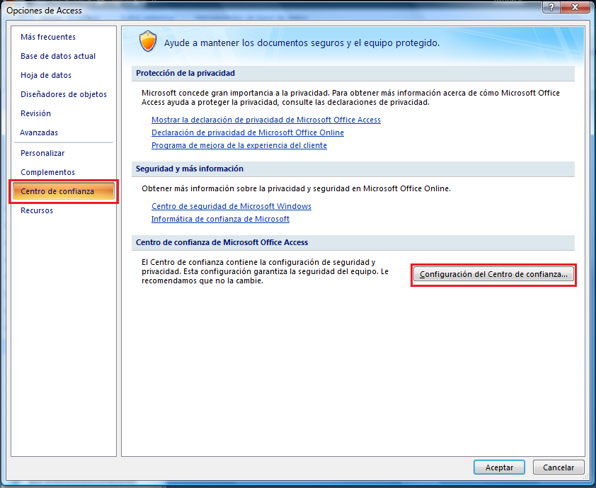 | A continuación en Centro de confianza (Trust Center) y en Configuración del Centro de confianza (Trust Center Settings) |